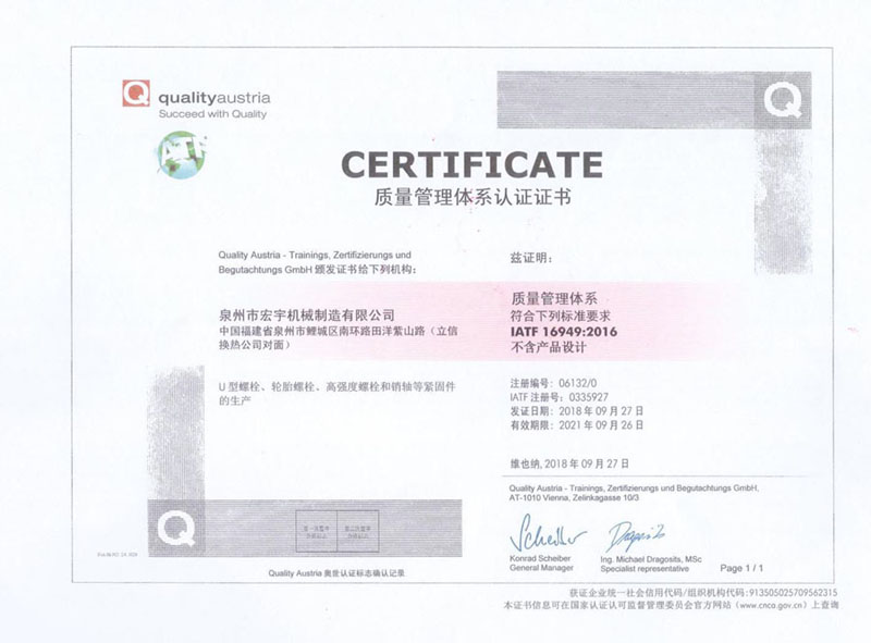 泉州(zhōu)市宏宇機(ji)械制造有(yǒu)限公司地(dì)處中國魅(mèi)力城市——泉(quán)州。專業生(shēng)産各種國(guó)産、進口汽(qì)車配件及(jí)工程機械(xie)配件⛹🏻♀️。主要(yào)産品有U型(xing)螺栓、輪胎(tāi)螺栓、防松(sōng)螺栓、高強(qiang)度螺栓、螺(luo)母、銷軸等(děng)産品。